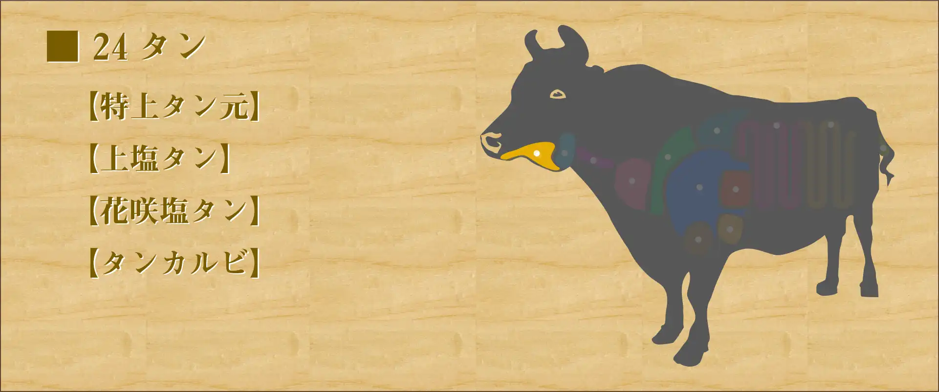 牛の舌。 付け根は「タンモト」と呼ばれ高級部位で柔らかく重宝される。 ビタミンB群が豊富に含まれている。 程よい歯ごたえと独特の食感で人気の高い部位。 噛むほどに旨味が染み出し香りも楽しめる。薄くスライスしてあるタンは火を通しすぎると硬くなるため、さっと炙るように焼くのが良い。