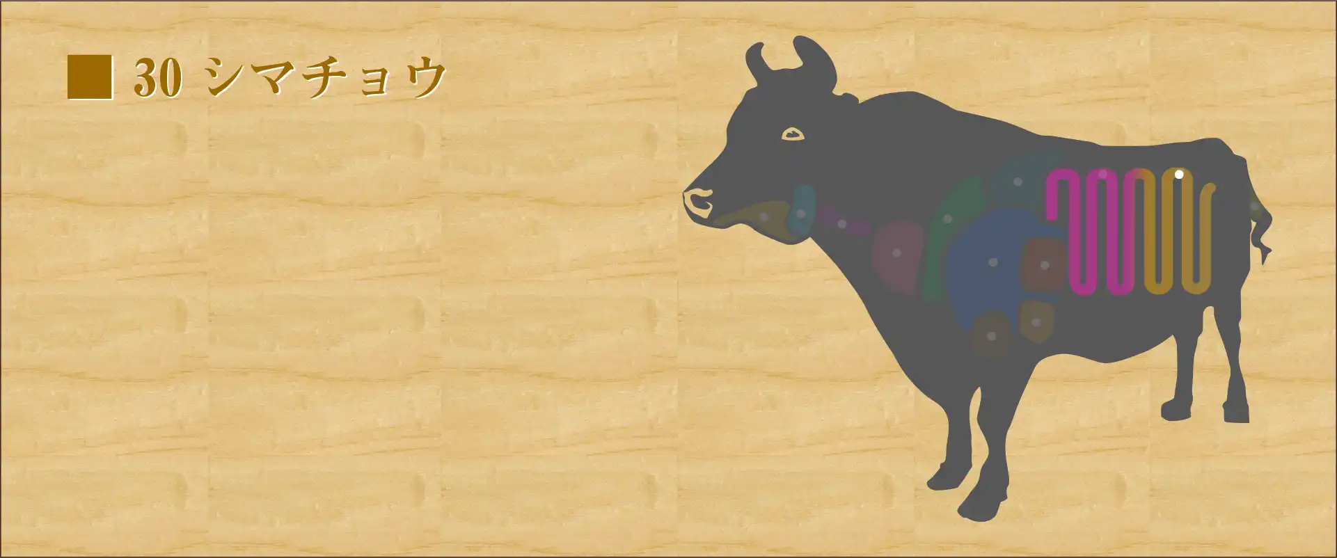 牛の大腸。 その名の通りシマ模様が入っている。 マルチョウより脂は少ないが、皮に厚みがあり、独特の歯ごたえがある。 脂の旨味は濃厚だが、割とさっぱり食べられる。 下処理に手間がかかるが、きちんと処理されたシマチョウは臭みがなく、柔らかく独特の香りと旨味でホルモンの中でも屈指の人気を持つ。
