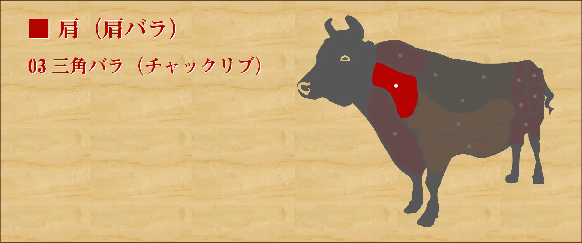 1頭の牛から数㎏しか取れない希少部位。 肩ばらの内側にある部位で第1〜6肋骨の部分を三角形に切り取った部位。 霜降りがとても美しく、その霜降りに負けない味の濃さと旨味を持つ。 バラ肉(カルビ)の中でも屈指の美味しさを持つとも言われ、焼肉にして適度に脂を落とすと旨味が引き立ち、味わい深い。