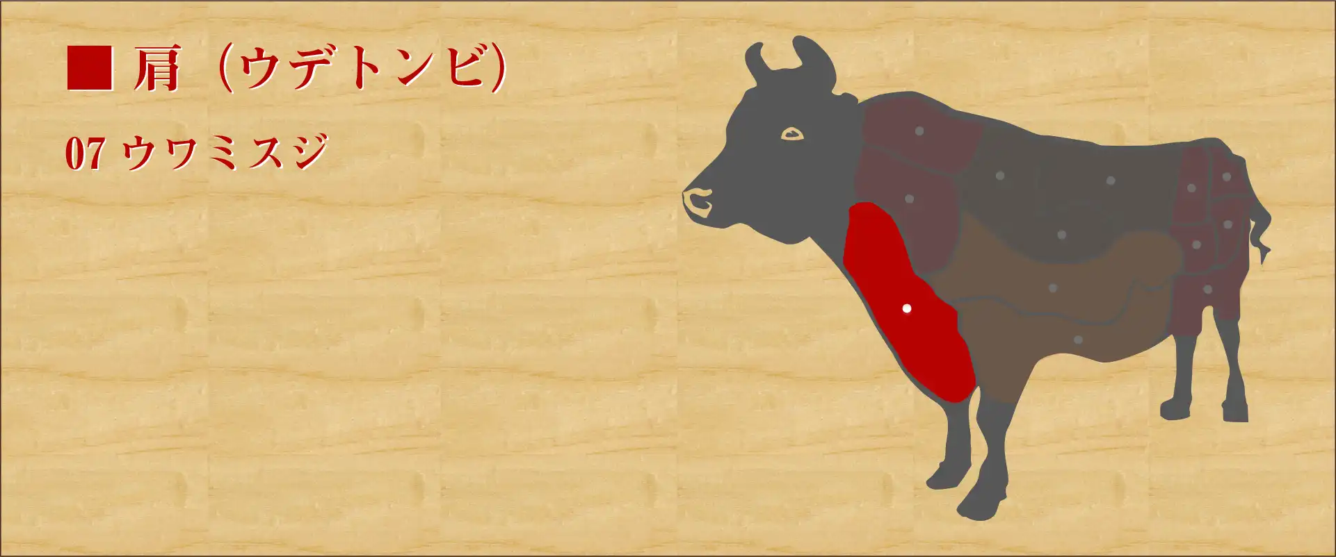 1頭の牛から約2kgしか取れない希少部位。 肩から腕にかかる細長い塊肉が唐辛子のようなことから別名「とうがらし」とも呼ぶ。 しっかりした肉質で内側部分には細かなサシが入っており、肉味はさっぱりと甘い。 多少スジがあるが、噛むほどに味がでて肉汁が多く、赤身好きな人にはおすすめの部位。