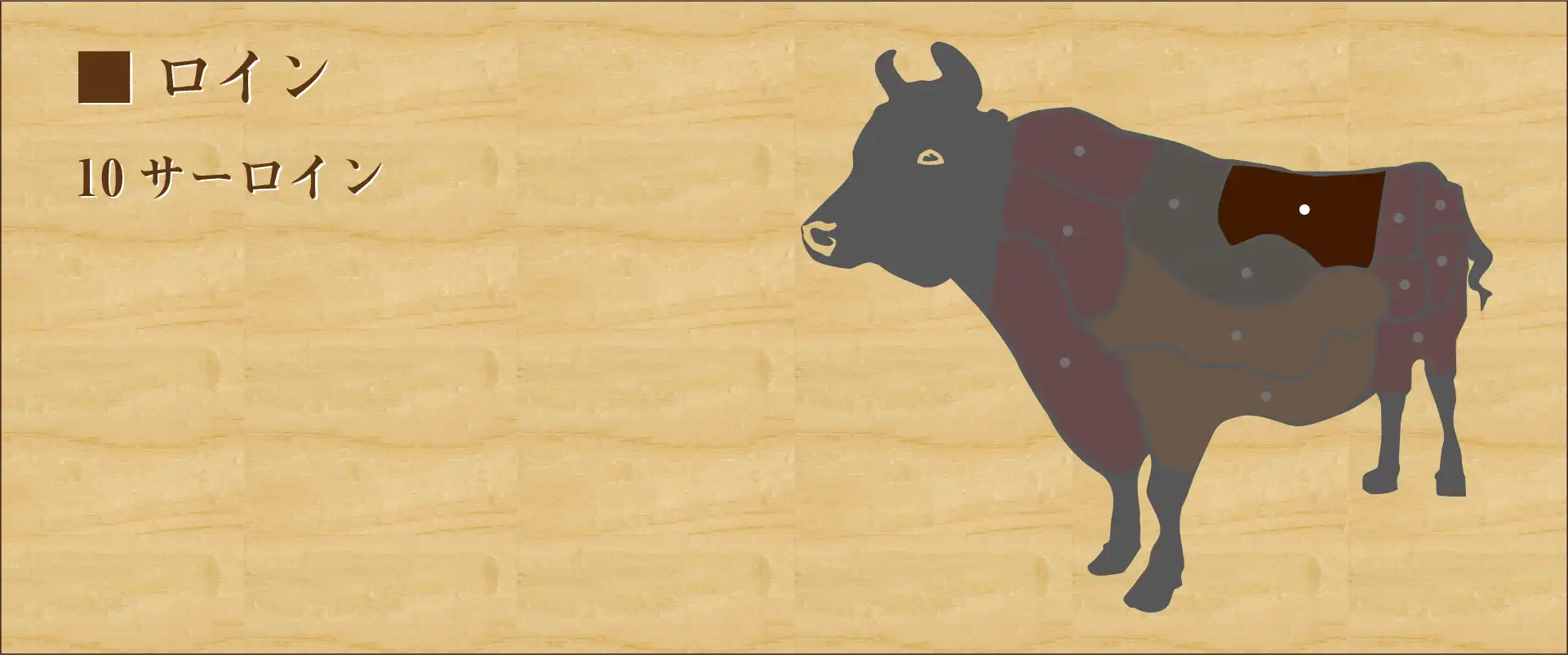 リブロースからモモ肉へと続く腰側の部位。 見栄えする形と霜降りの美しさからステーキとしてのよく使われる。 サーロインの語源として、あまりの美味しさに感激したイギリスの王様によって「サー」(ナイト爵)の称号を与えられたという逸話もある。霜降りが細かく、脂の甘味を存分に堪能することができる。