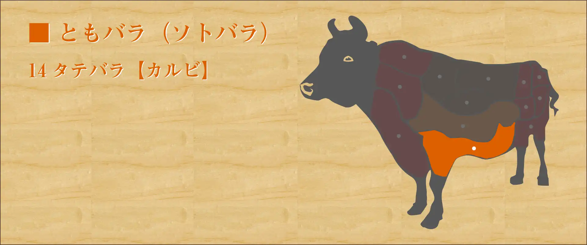 肋骨の間にある肉をそぎ落とした部位。 他のバラ肉の部位に比べ脂が多めで肉の味もしっかりしていて濃厚かつジューシー。 ただし脂がしっかりのっているのでこってりしている。 牛肉の質によって味の違いが出やすい部位のため、肉の良し悪しが大きく関係する。 しっかり脂に火を通して食べると美味。