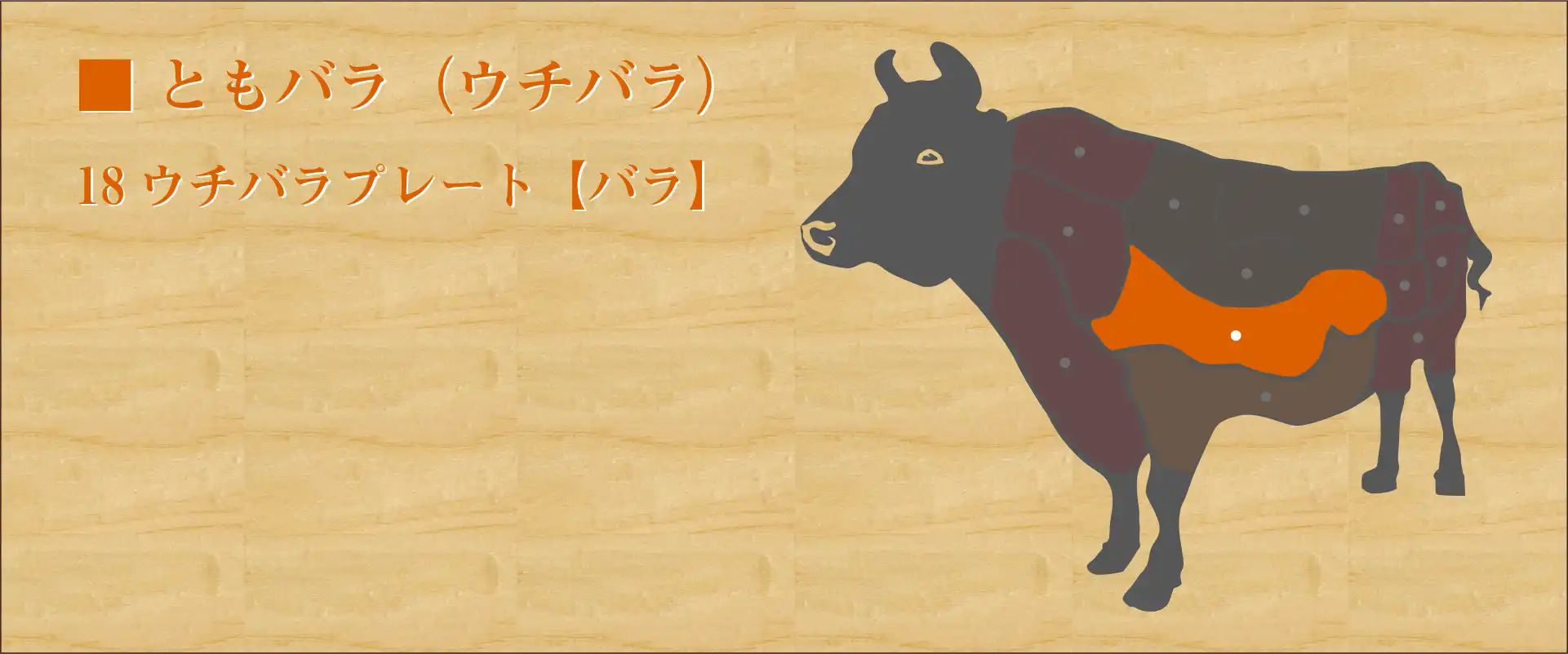 横隔膜(ハラミ)の近く、ソトバラの内側の部位でバラ肉のひとつ。 ハラミのような濃厚な食感がありながらソトバラ特有の脂が豊富なため、独特のコクと強い旨味が特徴。 食感は少しざっくりとして歯ごたえがあるが、噛むほどに肉の味が染み出る。 軽く炙るように焼き表面がカリッとしてきたら食べ頃。