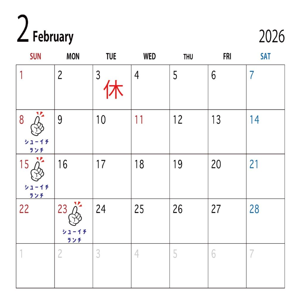 シューイチランチの営業は8日(日)、15日(日)、23日(月・祝)になります。ランチならではのお得な限定メニューもございますので、ぜひご賞味ください!