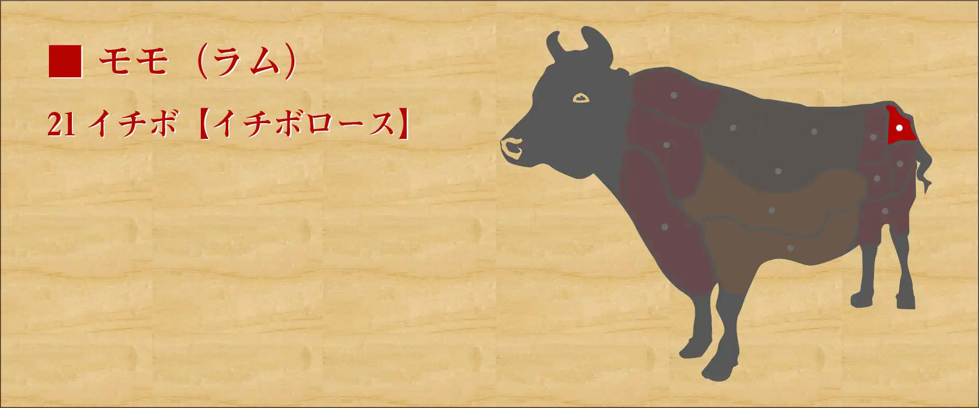 腰からお尻、モモにかけての部位。モモ肉の中でも特に柔らかいく、肉質はきめ細かい。 赤身部分は肉本来の味を味わうことができ、細かいサシが入るため噛むほどに旨味が広がっていく。 脂っこさとクセが少ないため食べ飽きることがない。 火を通しすぎないように気を付けて肉汁の濃厚な旨味を堪能する。